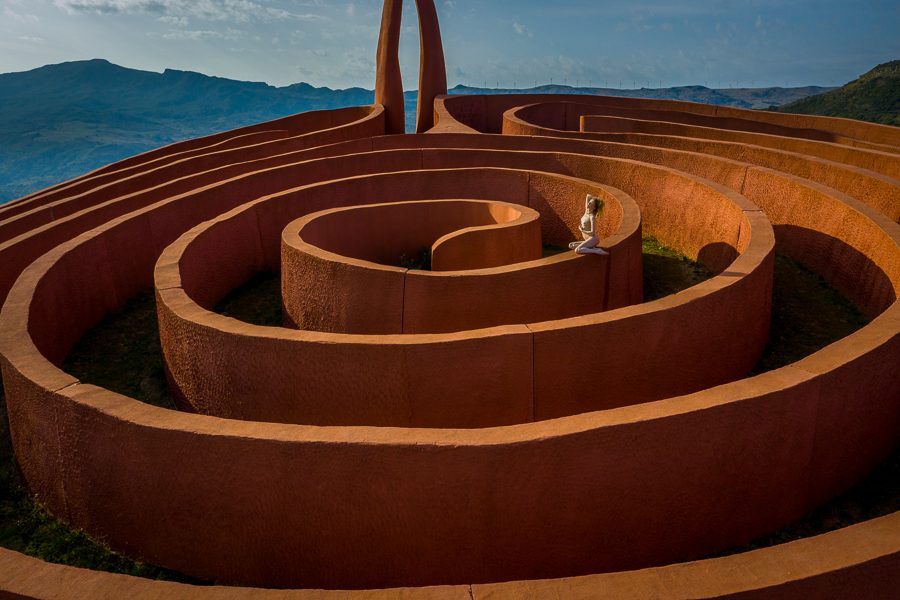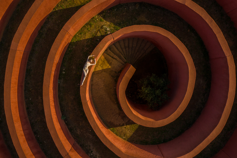 As an example, the series of images of Lulu Lockhart in this blog post are taken at a maze that is up in the mountains in Italy. Many of my images are about shapes, so the beautiful curves of the maze were perfect for my style of images, but I would never in a million years have come up with the prompt “Lulu standing on a huge orange maze up in the mountains” or anything remotely similar.
