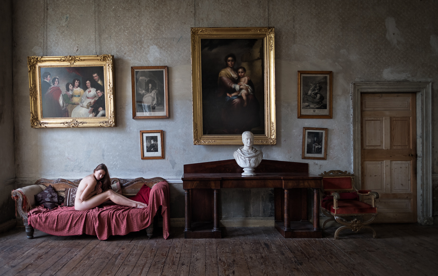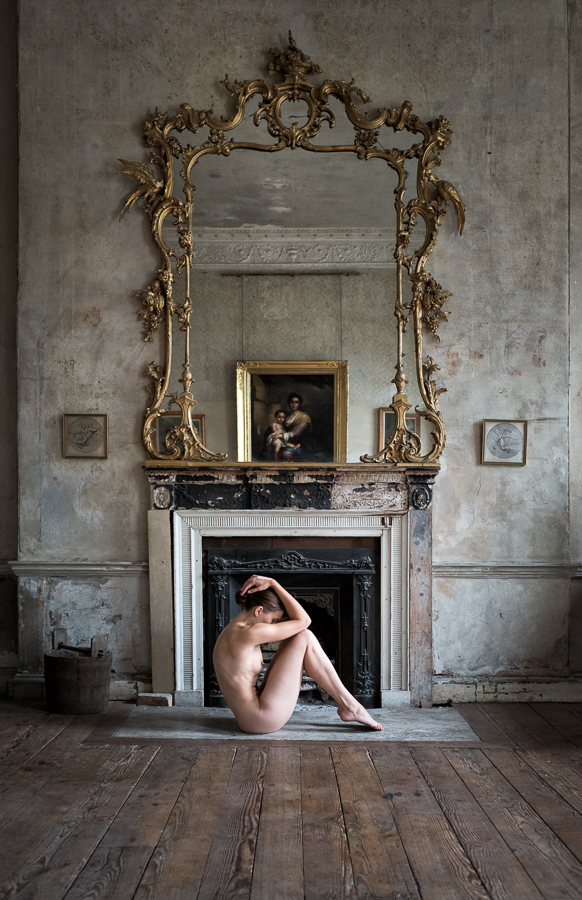 I love the contrasts here between the textures of the wall and the grandeur of the mirror and painting in the background, with Anete doing a great pose in the fireplace.