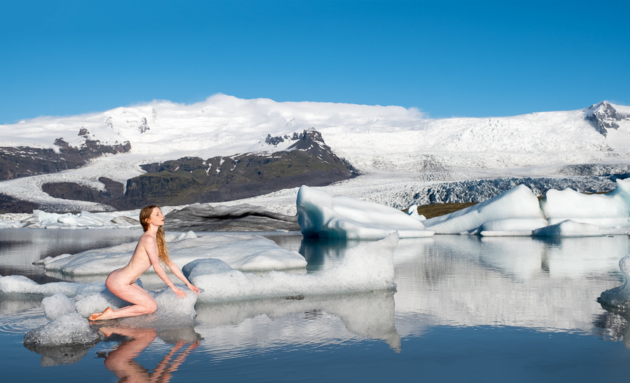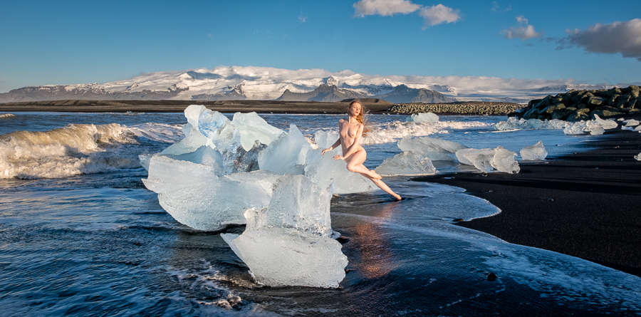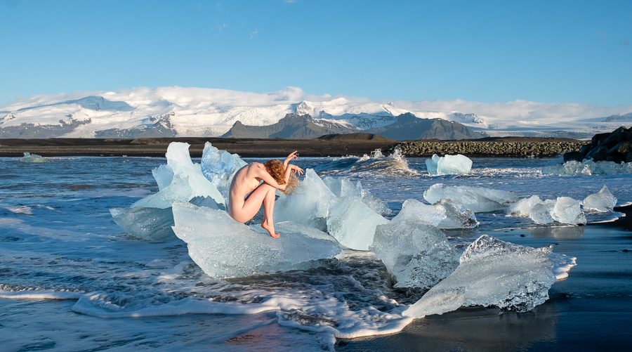 For the first set we spent a very long time watching the waves coming in and seeing which blocks of ice were stable so were suitable for posing on. Then the much shorter shooting time, which is where the fact that I shoot very quickly comes in handy. I also had my trousers unzipped at the knees and was standing in the sea barefoot, and I take my coat off when the models is nude in cold conditions, all of which gave me a very small sense of how cold it was for Lulu.