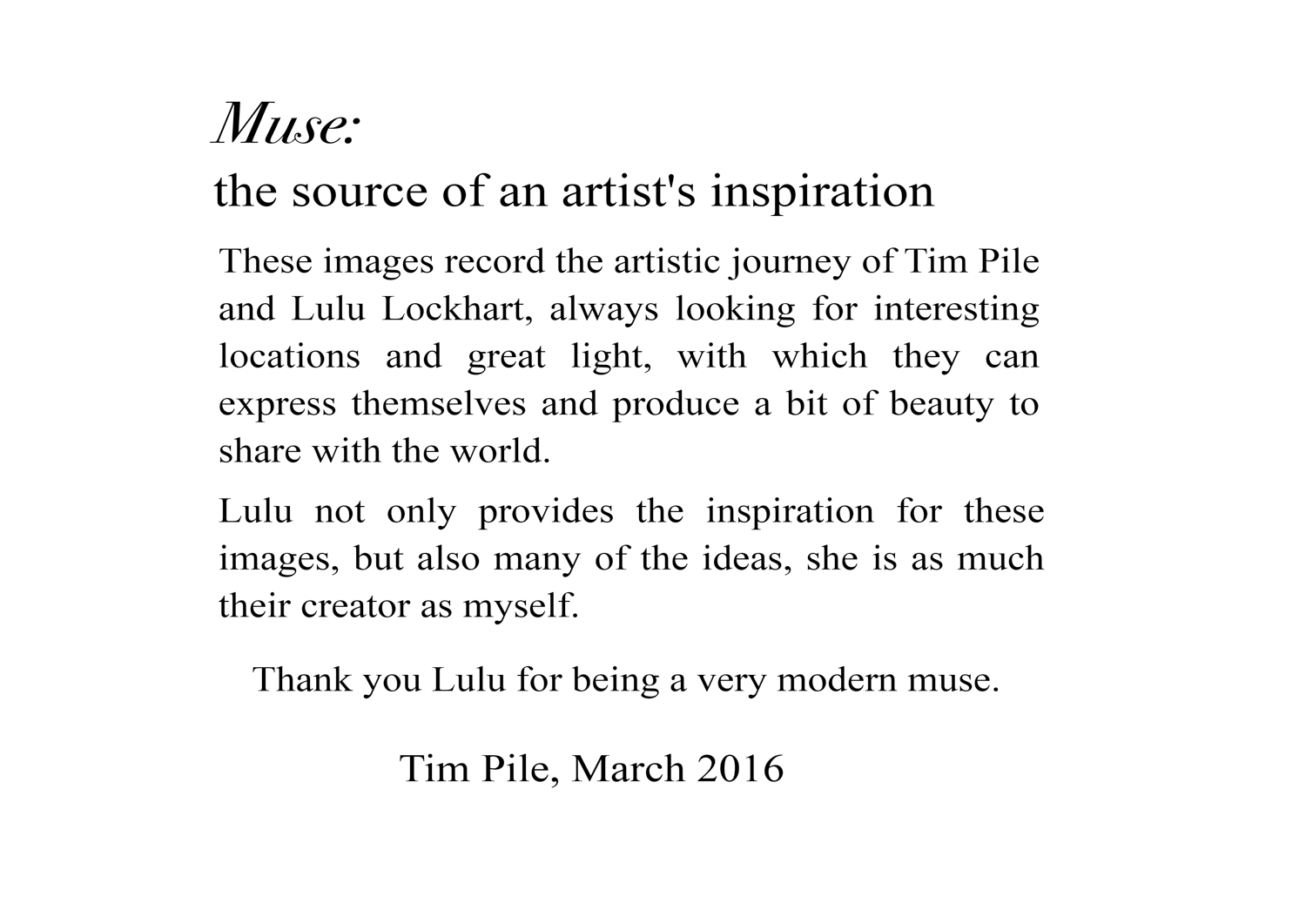 The word Muse is often misused, but looking at the dictionary definition I thought it fitted perfectly. Lulu does inspire me to produce images, but far more than that she is extremely pro-active in all aspects of the image-making process, making our shoots both immensely enjoyable and extremely productive, I hope that comes across in the introduction to the book.