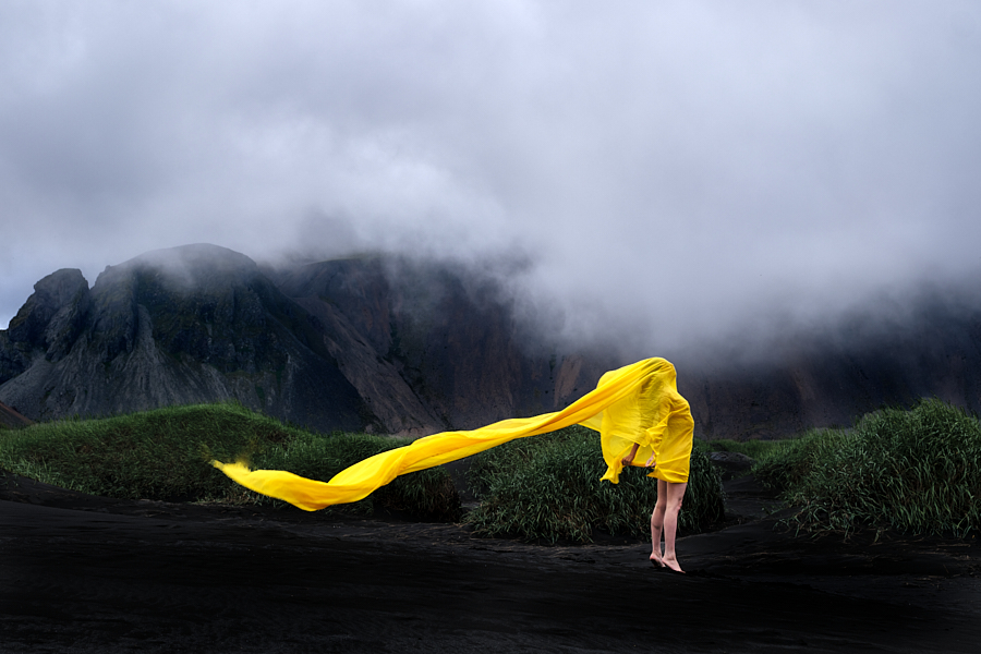 The first is from near the Vestrahorn mountain with a nice bit of mist over it. I think the yellow material provides a pop of colour against the moody background, and the material shows how windy it was.