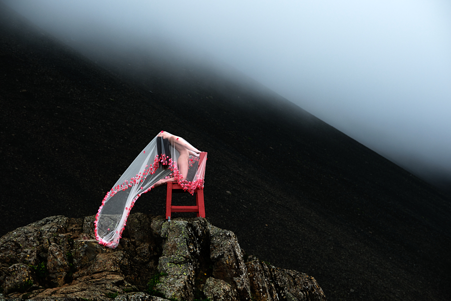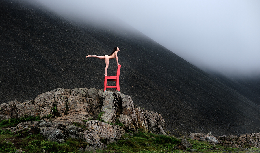 The next set are not too far from the Vestrahorn, and show Rebecca’s creative posing with an oversized chair that somebody has anchored to some rocks near the ring road. One of Marie’s props also came into it’s own. Again the moody background helps the images.
