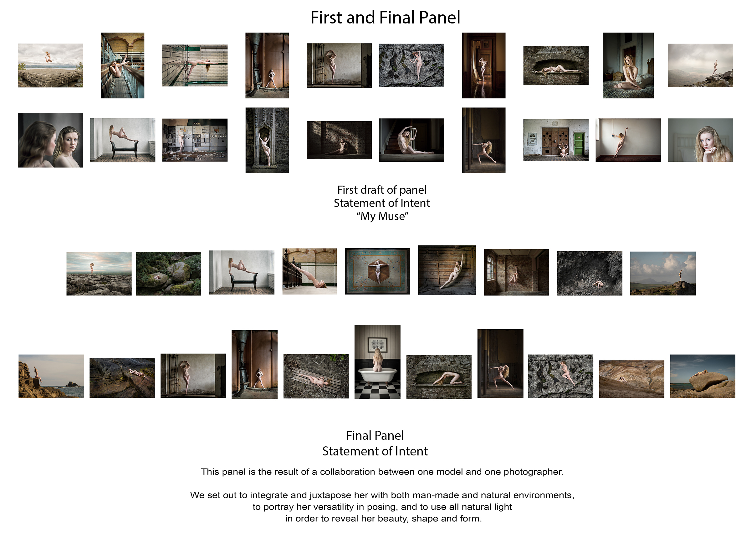“This panel is the result of a collaboration between one model and one photographer. We set out to integrate and juxtapose her with both man-made and natural environments, to portray her versatility in posing, and to use all natural light in order to reveal her beauty, shape and form.”