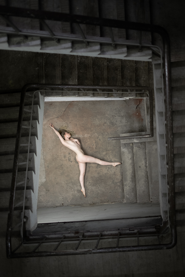 It’s always very difficult to pose models at the bottom of staircases, as often it seems like they’ve fallen down the stairs and they look like a dead body. People often ask whether I give direction to models, and on this occasion I recall shouting down “try not to look dead”, which I think she has done splendidly. The bannister provides a great lead in.