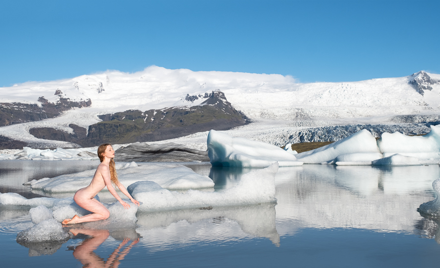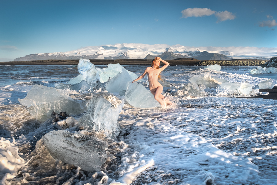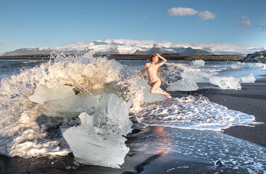 On the advice of friend who is a guide in Iceland I would like to point out that the beaches and glacier lagoons in Iceland are very dangerous, and tourists get injured there or worse every year. Lulu and I are very experienced in working together, and at working on location in potentially hazardous areas. In all of these images we kept very close to the shore, and I checked the stability of the ice and depth of water beforehand. While some of our images look spectacular and dangerous we would not do any that we thought unsafe, and indeed walk away from many shots for this reason.